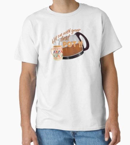 A fun design of a Coffee Pot and Mug with the words "Hit me with your best Pot" on a classic T-shirt great for everyday wear and coffee lovers everywhere.