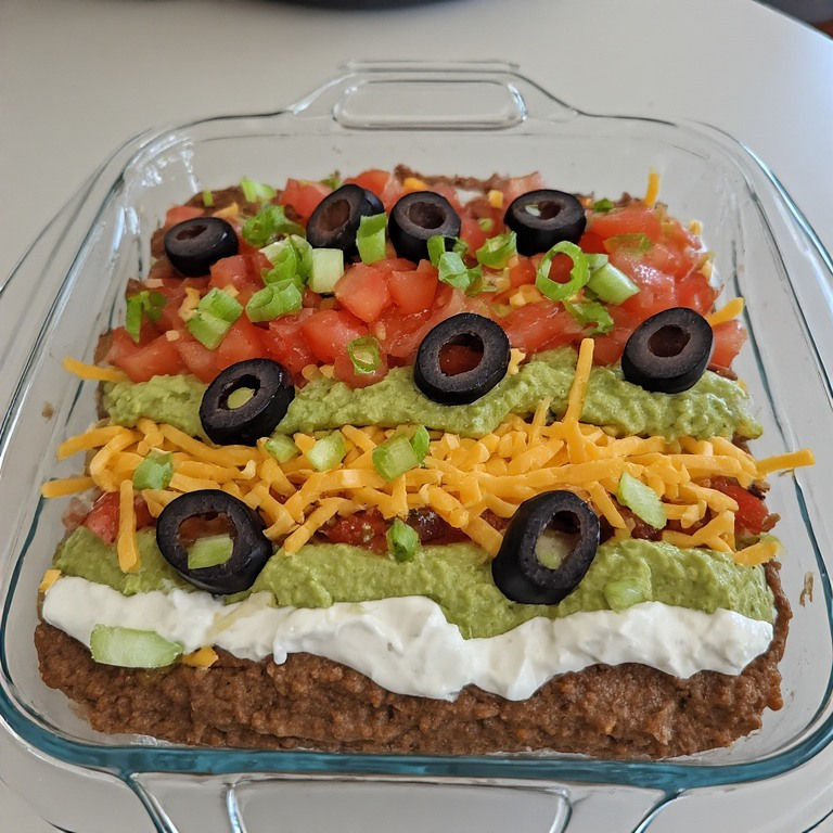 Layer 1: 1 can (16 oz) refried beans (mixed with 1 tbsp taco seasoning or a splash of salsa for flavor)