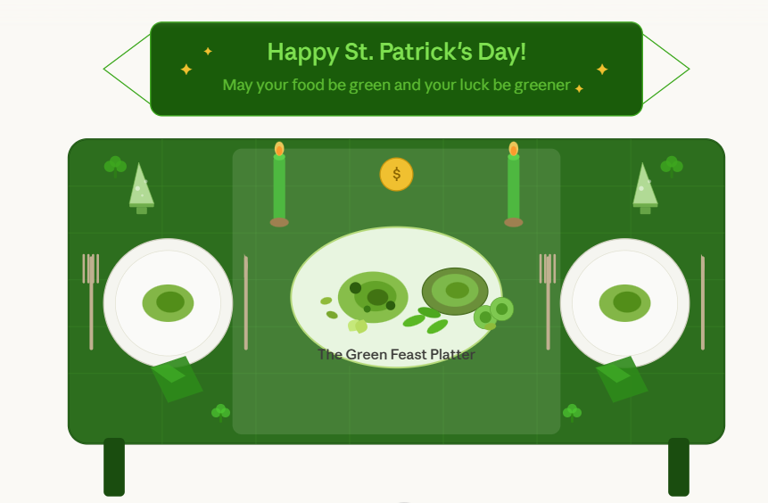 The recipe hits all the green food groups that actually taste amazing: creamy guac, nutty pesto pasta, crisp snap peas, cool cucumber, and pistachios for crunch. The table has your candles, shamrock napkins, green drinks, and even a little pot-o'-gold coin at center stage.