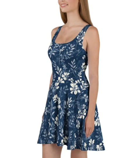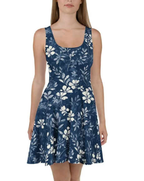 Step into effortless style with this Navy Blue Floral Skater Dress, featuring a sophisticated and intricate white botanical leaf and flower print. Crafted for both comfort and elegance, this sleeveless A-line dress offers a flattering fit with its fitted bodice and flared, flowy skirt that hits at the perfect mid-thigh length.