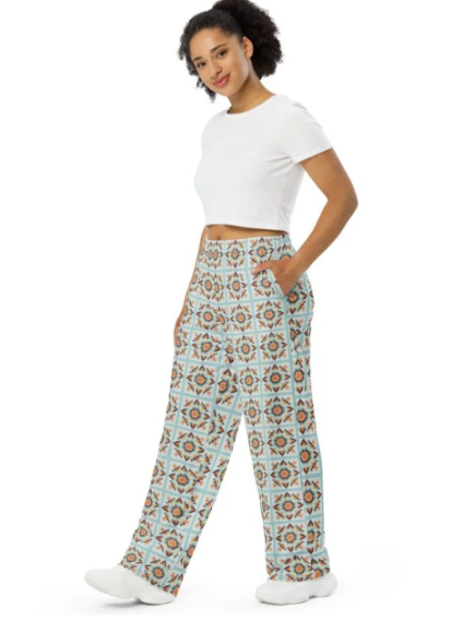 Quilt Style Pattern Design. All-over print wide leg pants. Like your favorite sweatpants but better.