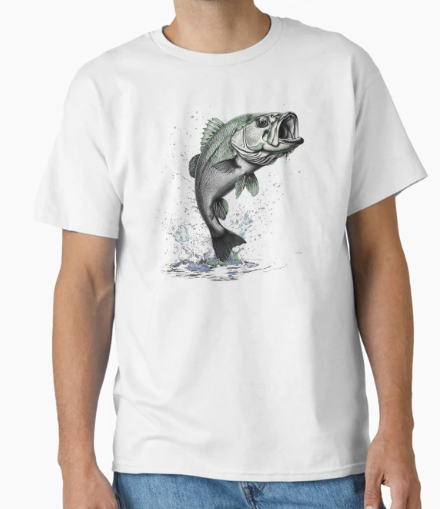A large mouth bass leaping out of the water design on classic everyday wear T-Shirt. Great gift idea for the fisherman or nature lover in you life.